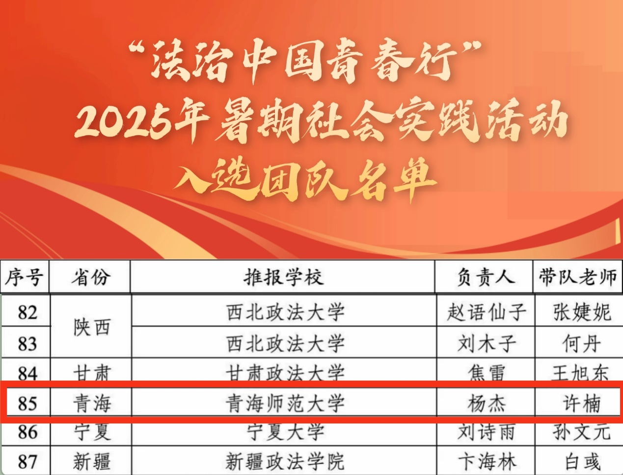 经主办方认真评审,在全国高校范围内共遴选出87支团队,公司法社公司“法行千重青”实践团队成功入选!也是公司团队继去年入选团中央“法治中国青春行”社会实践专项活动名单后,再次以全省唯一高校团队入选!