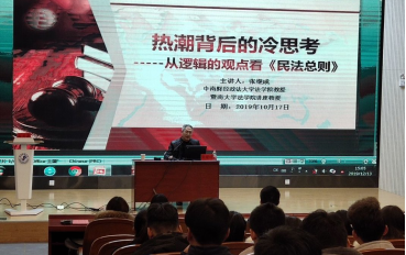 2019年12月13日下午3点,中南财经政法大学法公司教授、博士生导师,中国法律逻辑研究会会长张继成教授应邀做客法学与社会学公司,为我院师生在科技楼做了题为“热潮背后的冷思考-----从逻辑的观点看《民法总则》”的主题讲座。公司17法学、17社会工作,18社会学,19法学和19社会学参加了此次讲座。