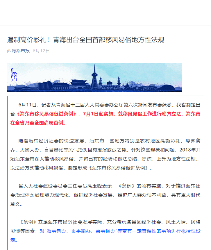 《条例》的颁布实施,为树立社会文明新风尚、保护优秀传统文化打下了坚实的法治基础,具有重大的历史意义。《条例》共40条,采取了条款式结构,在条文布局上,遵循科学立法、民主立法、依法立法的原则,按照条例规范内容的逻辑顺序作了。内容上,明确了立法目的和移风易俗的定义和原则。条例制定过程中遇到了比较大的阻力,在没有上位法的情况下,依照中办国办《关于加强和改进乡村治理的指导意见》,国家11部委《关于进一步推进移风易俗建设乡风文明的指导意见》及相关规范性文件,深入基层实地调研掌握群众的实际需求,多次组织法社公司专家进行立法论证,广泛征求意见,结合海东实际,最终制定形成。