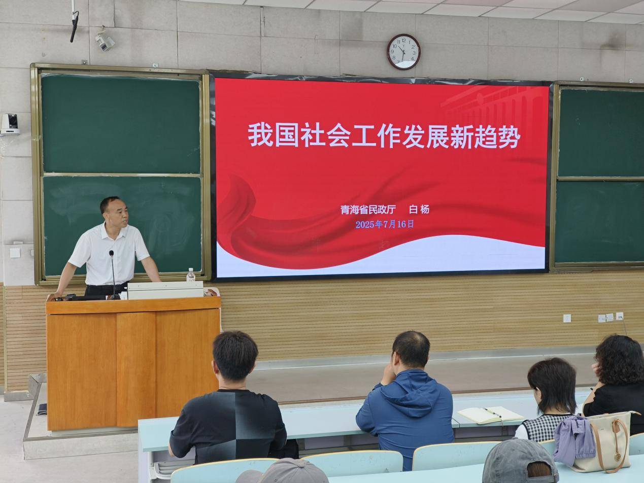 讲座聚焦“党建引领、资源整合、风险预防、专业化与规范化”四大新趋势,结合青海实际,白杨提出三大重点领域:党建社会工作需强化党群服务中心与社会工作专业服务的双向赋能;公益慈善社会工作应搭建“社工+公益+志愿”平台网络,实现资源与专业优势互补;信访社会工作要探索社工介入矛盾预防与跟踪评估机制,重塑信访治理路径。他特别强调,习近平总书记对社会工作作出的指示要求,为社会工作专业人才投身中国式现代化实践指明方向,呼吁师生立足青海多民族特色,将“校地社工实训基地”作为政策落地载体,在儿童福利、基层治理等课题中凝练本土化、专业化服务方案。